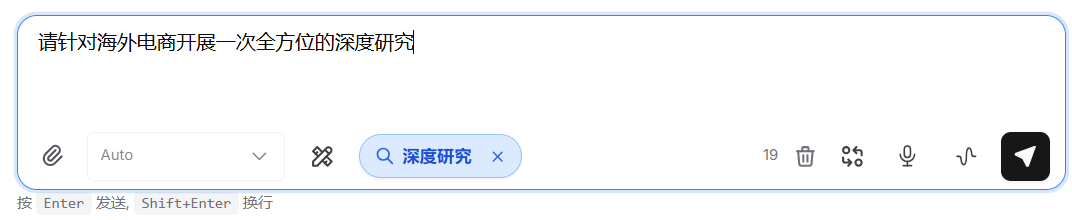 - 点击聊天框下方的图标选择“深度研究”,输入提示词。可以输入一句话表示要研究的主题,也可以提供更详细的信息,信息越详细,背景信息越多,调研内容更符合要求。