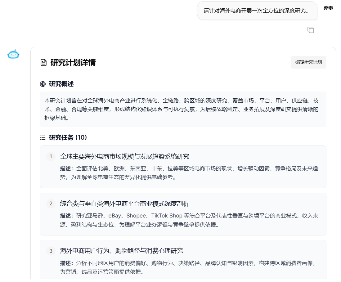 - 输入研究的主题发送后,为了保证整个过程透明且可控,机器人会提供一个研究计划(研究任务清单),我们可以检查整个研究计划是否符合预期,并且能够在右上角点击编辑研究计划对研究任务进行修改。