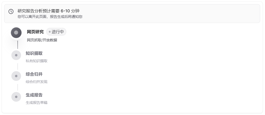 - 生成研究报告的时间较长,需要6-10分钟左右。