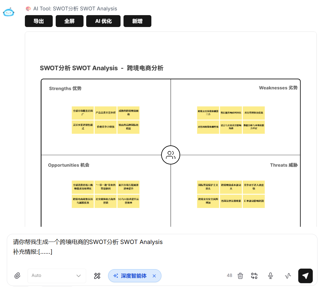 点击聊天框下方的图标选择“深度智能体”,输入提示词:请你帮我生成"[工具名称]",(最好追加足够的补充信息),深度智能体就能自动查询和调取后台已有的工具,生成可视化内容。