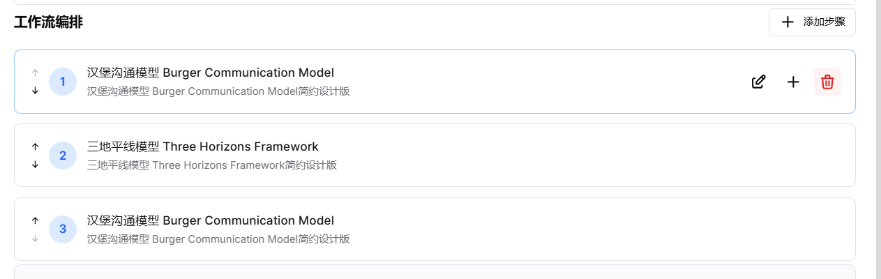 - 使用左侧小箭头调整顺序,右边编辑按钮可重选,+号新增。操作后确认工作流编排正确。