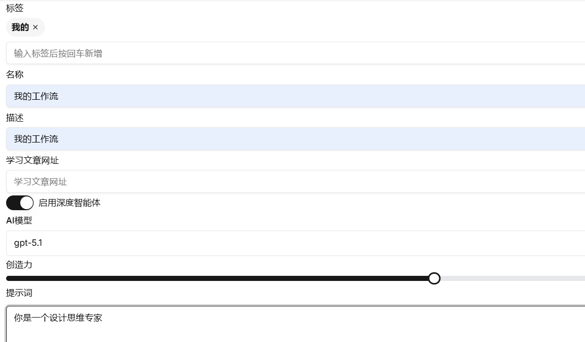 - 在创建智能体的界面,依次输入标签、名称、描述、启用深度智能体、提示词。提示词可以填写“你是一个设计思维专家。”