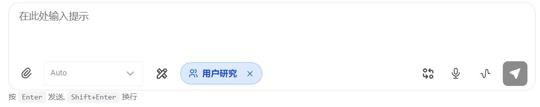 - 点击聊天框下方的图标选择“用户研究”,输入提示词。可以输入一句话表示要研究的主题,也可以提供更详细的信息,信息越详细,背景信息越多,研究内容更符合要求。