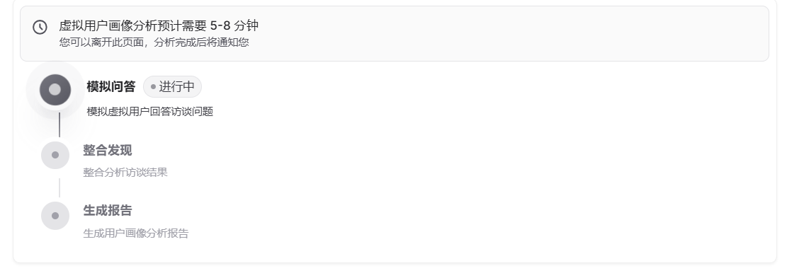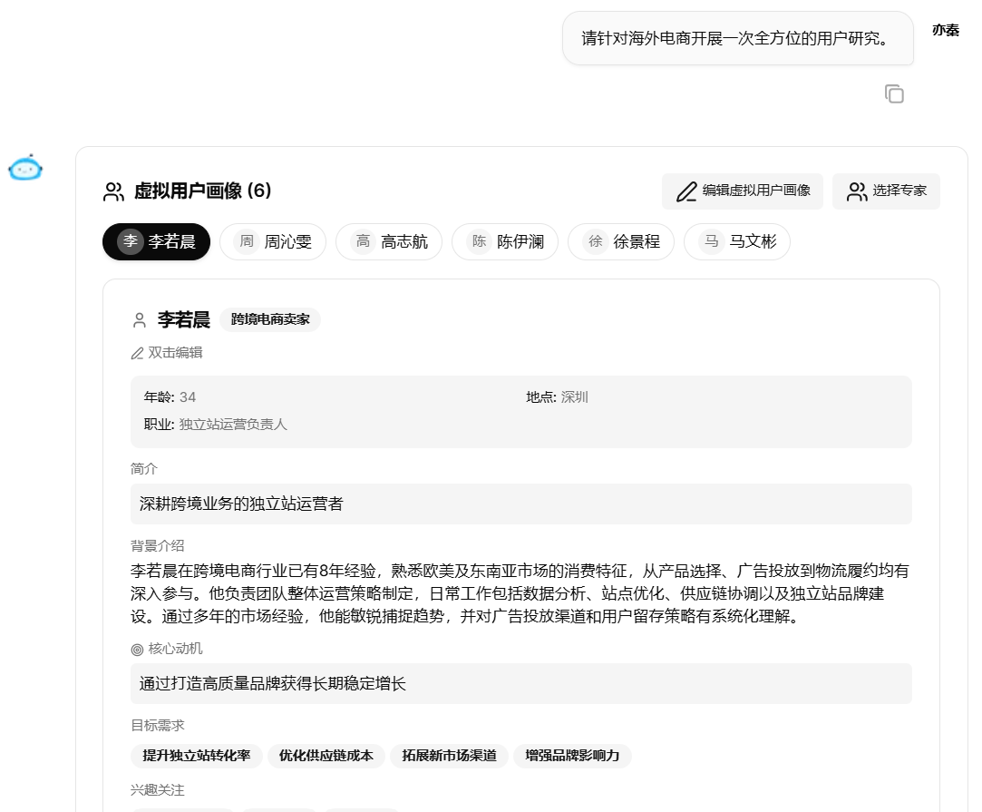 - 输入研究的主题发送后,机器人会提供数个用户画像(可以在提示词中指定虚拟用户画像的个数)。