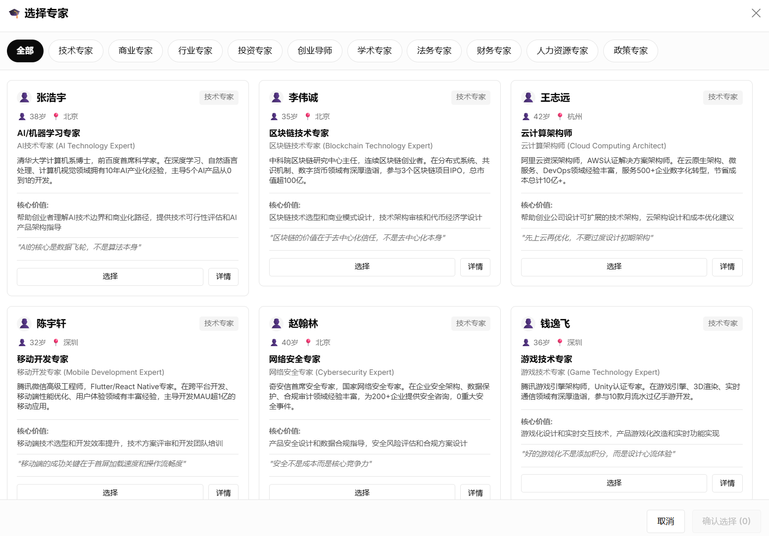 为了让用户能按需挑选单一特定领域的精准专业视角开展用户研究,既覆盖多领域需求又保证单视角分析的聚焦度,避免多视角混杂干扰,让目标群体的痛点、需求分析更贴合对应专业维度,为产品迭代和服务设计提供精准支撑,目前提供了四十多位不同领域的专家。