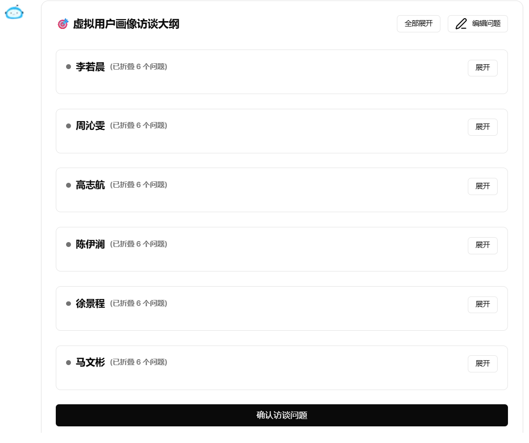 - 确认好对象用户设定,选择好专家后,下一步机器人会对这些虚拟用户进行访谈,访谈问题同样可以进行编辑。