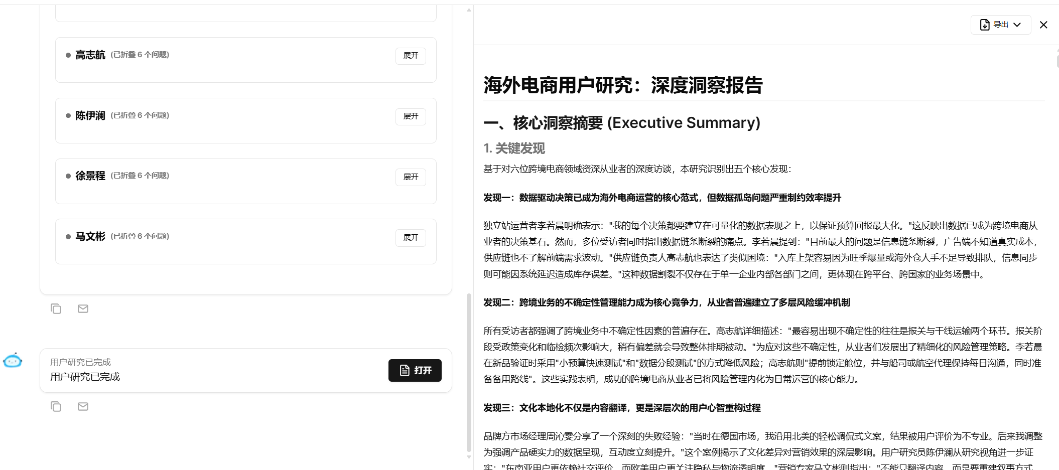 - 最终会生成一篇万字以上的详尽的深度用户研究洞察报告。